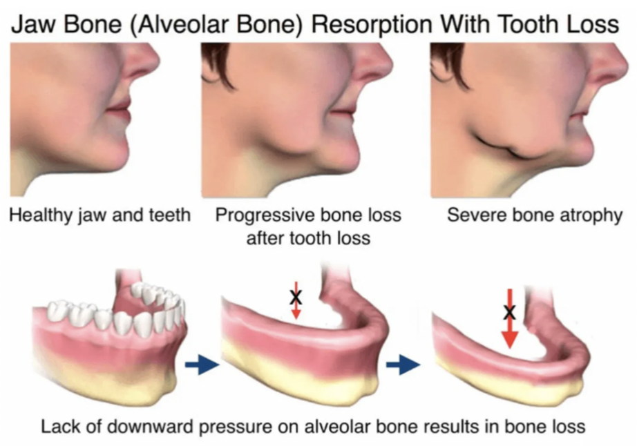 Missing tooth roots leads to long term bone loss. As the jaw(s) shrink, facial sagging, and advanced aging occur.